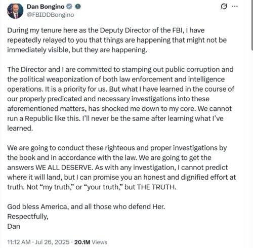 In recent days, Dan Bongino (formerly a podcast host and Secret Service Agent) and now Deputy Director of the FBI startled many with this post on X.