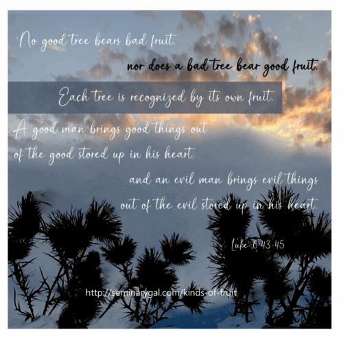 Jesus said, “No good tree bears bad fruit, nor does a bad tree bear good fruit. Each tree is recognized by its own fruit. People do not pick figs from thornbushes, or grapes from briers. A good man brings good things out of the good stored up in his heart, and an evil man brings evil things out of the evil stored up in his heart. For the mouth speaks what the heart is full of.” (Luke 6:43-45)