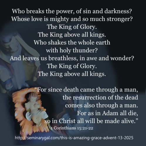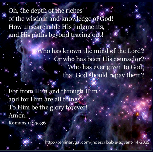 Acknowledging inquiries about an entire season’s devotionals for your study group’s planning purposes, Seminary Gal’s prior seasons’ Advent devotionals can be accessed via the search feature to the right and are as follows: