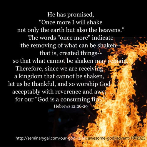 “He has promised, “Once more I will shake not only the earth but also the heavens.” The words “once more” indicate the removing of what can be shaken– that is, created things– so that what cannot be shaken may remain. Therefore, since we are receiving a kingdom that cannot be shaken, let us be thankful, and so worship God acceptably with reverence and awe, for our “God is a consuming fire.” (Hebrews 12:26-29)