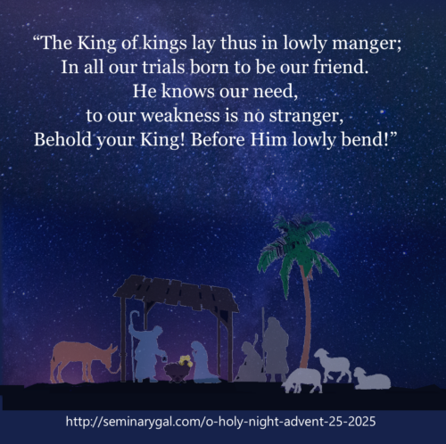 This hymn, often sung at midnight on Christmas Eve, goes by several different names: “Minuit, Chrétiens” meaning “Midnight, Christians”, the “Cantique de Noël” meaning “Christmas Hymn,” and “O Holy Night.” It reverently calls us to the manger, to see the King of kings and worship Him.