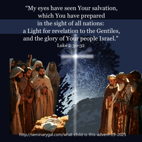 At Christmas, a prayer: Thank You, Lord Jesus, for Your birth, Your life, Your death and resurrection, for Your faithfulness, Your mercy, and Your plan from before Creation. Thank You for Your inclusiveness regarding Your Image-bearers throughout all nations and being a Light to us all. We praise You for the good news of Messiah so that You can draw people from every nation to repent and believe what You have done for all people. While we know that some will refuse to repent, refuse to believe, and refuse to acknowledge You as Lord, we are grateful that each man, woman, and child upon this earth throughout all time will have been given opportunity to see You for Who You are. Wise men and women still seek You as Savior. We praise You at Christmas and always. Amen.