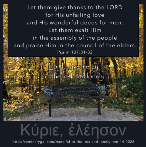 You can find these “Κύριε, ἐλέησον, ‘Lord, have mercy” devotionals here or you can “Like” Seminary Gal on Facebook and they’ll be delivered to your Facebook news feed. Advent and Lenten devotionals remain among my most popular offerings. You don’t want to miss this encounter with God to prepare your heart for Easter!