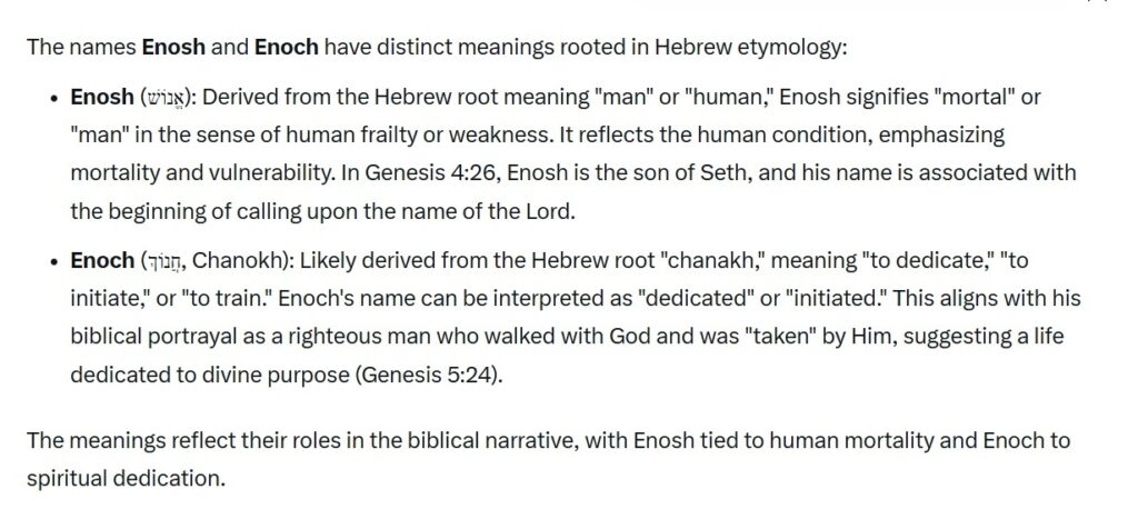 Look at this chart.  Consider the meanings of the name Enosh (humanity’s son of Seth, grandson of Adam) leading to Enoch (generations descended from Seth), a man who walked with God and never died.  How does God always preserve a remnant to walk faithfully with Him? In my series on the Remnant I asked, “Why might Eve, the mother of all living, have associated the third-born Seth with being in place of Abel, her second born who was killed? In what ways might redemption already be in the picture? Why does redemption focus on the remnant and not promote the trunk of a family tree?” Seth’s line would continue to Abraham, the great patriarch.